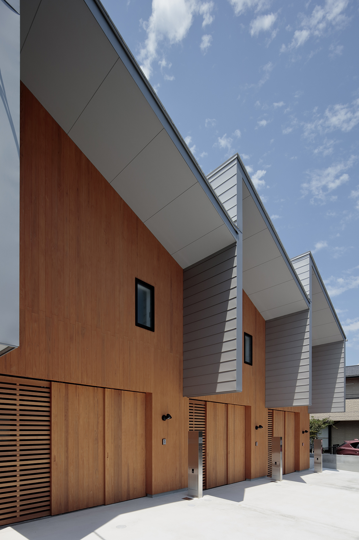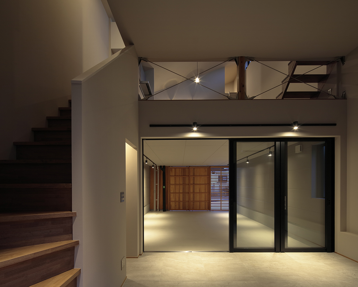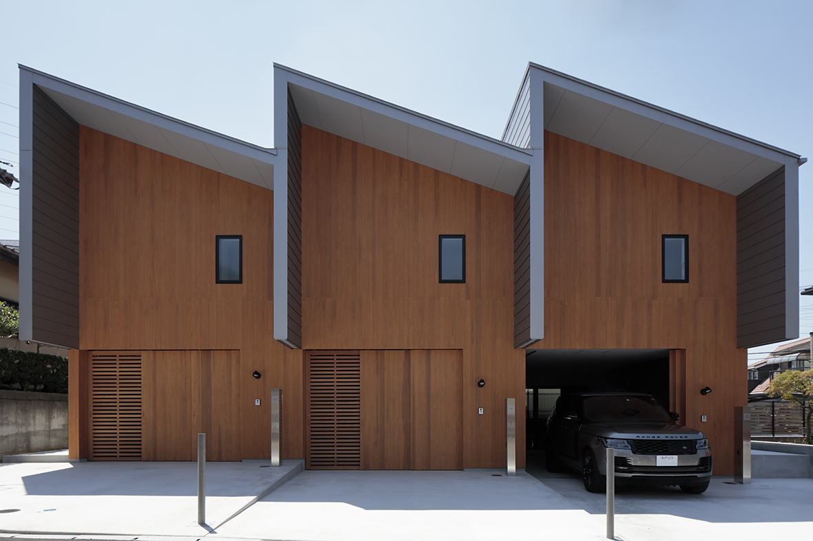 松戸に計画したビルトインガレージ付きの賃貸住宅です。各戸は長屋形式となっておりビルトインガレージと上階の1LDK+ロフトで構成されています。1Fのビルトインガレージは手前のオープンスペースを含めて活用ができ、玄関も広めに設計されているので車を眺めながら作業ができように設えとしています。2階は南側にハイサイドライトを取り、どの部屋でも採光と日射取得ができるようにしています。