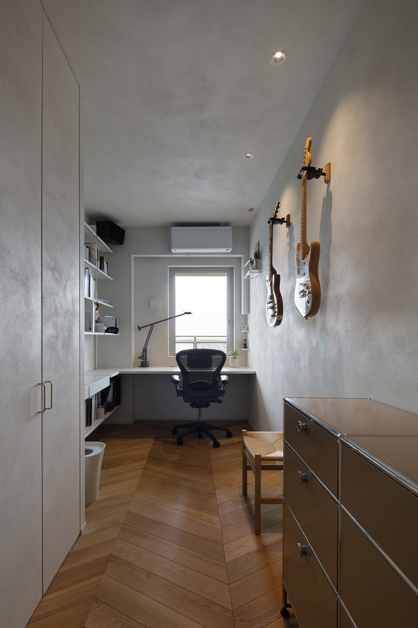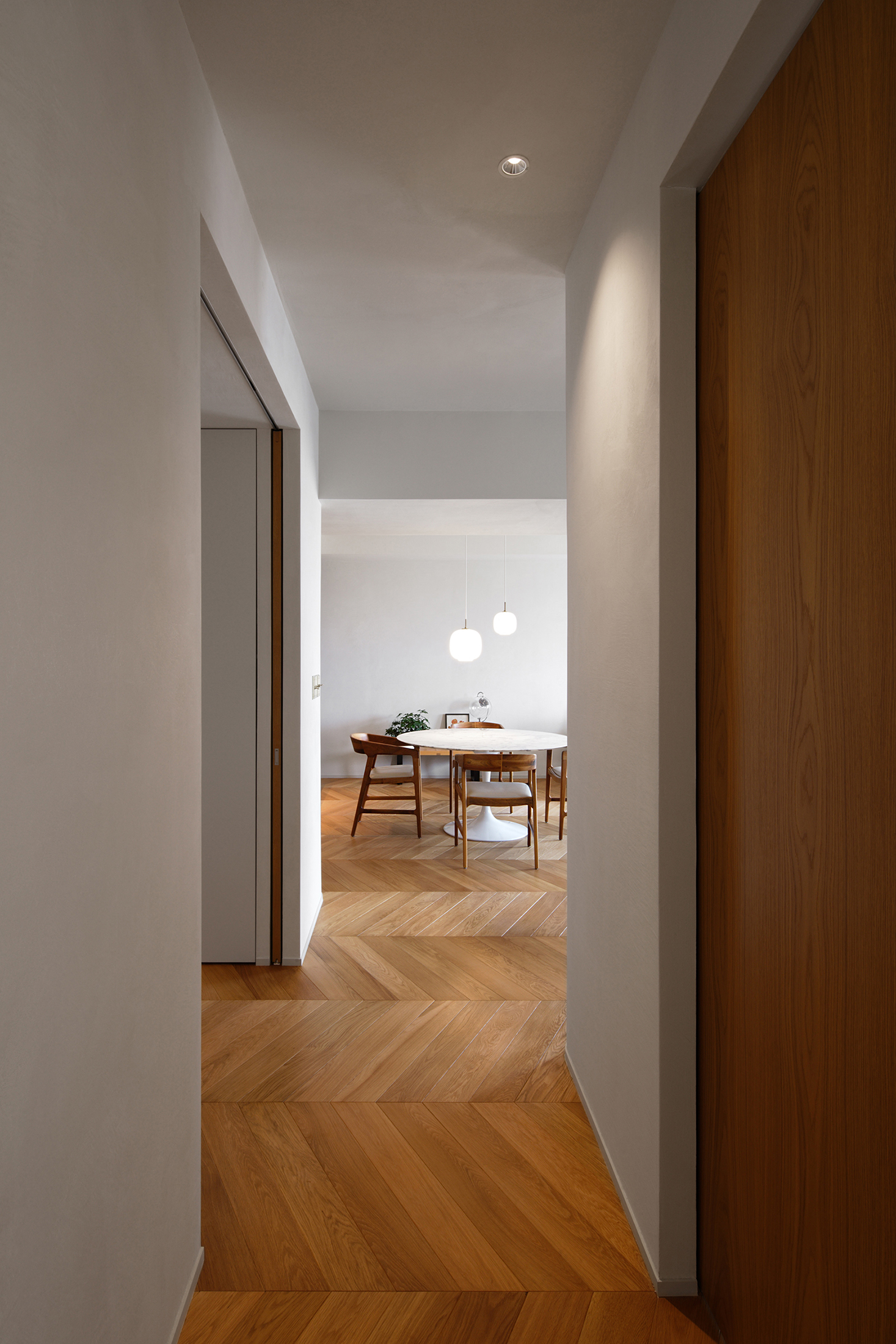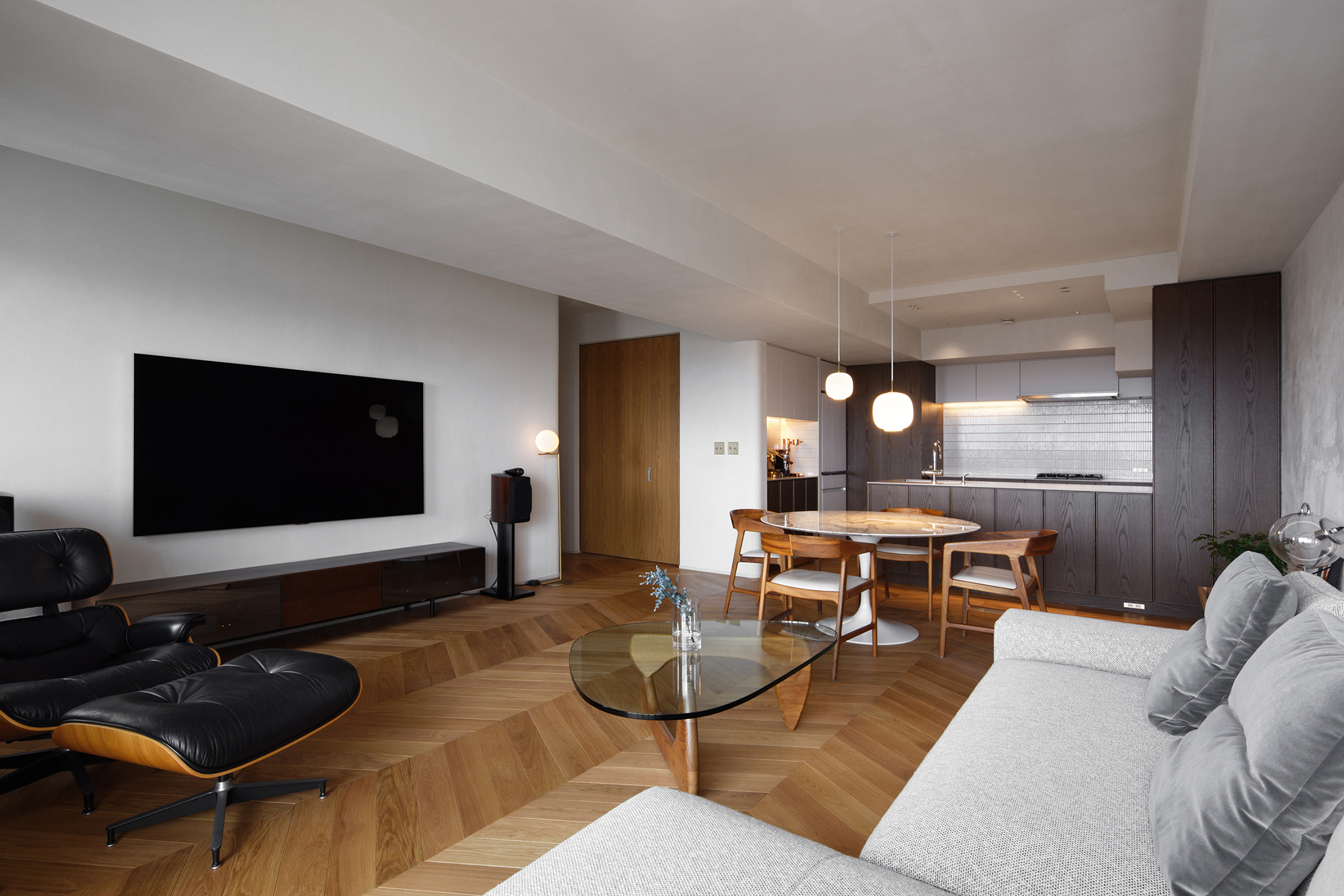 都内近郊に位置する 86 m²のマンションリノベーションです。海外生活が長かったクライアントは日本のマンションで多く利用されている化学的な建材ではなく、自然素材を用いた家 造りを求めており、都会というよりも以前住んでいた海外の昔ながらの田舎の家が持つ「素の良さ」を設計では目指しました。建物は築年数も経過しておらず断熱性能も低下していな いことから既存断熱材を残してのフルリノベーションとし、間取りは倉庫代わりとなっていた1部屋をリビング・ダイニングに組み込んだ2LDK となっています。クライアントは数多 くのデザイナー家具を所有しており、年月が経過しても良さが保たれるものに価値を感じていました。そこでクライアントが求めたヘリンボーンのフローリング、左官壁、キッチンの 面材などの僅かな寸法や見付の高さ、幅やテクスチャをクライアントがお持ちの家具のテイストと調和するように吟味することを設計の主眼としています。家具の台輪の僅かな寸法の 微調整、扉の木材の導管の表現、目地なしのタイル、最小限の照明、いままで利用してたテーブルを洗面台へのリメイクなどクライアントが心地よく感じる空間を一緒に模索しながら クライアントにとって心地よい空間に仕立てました。