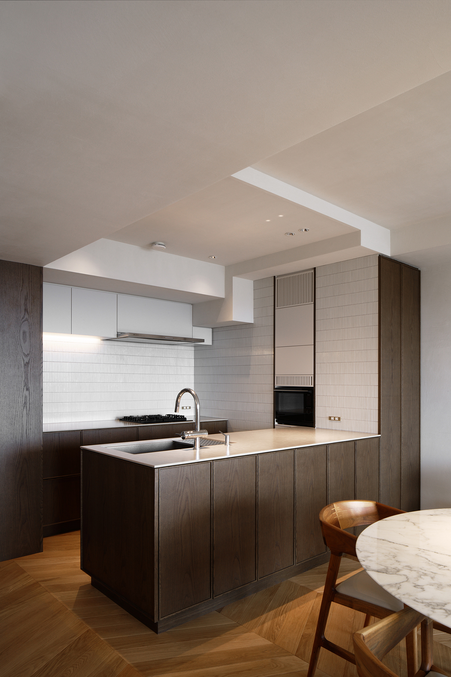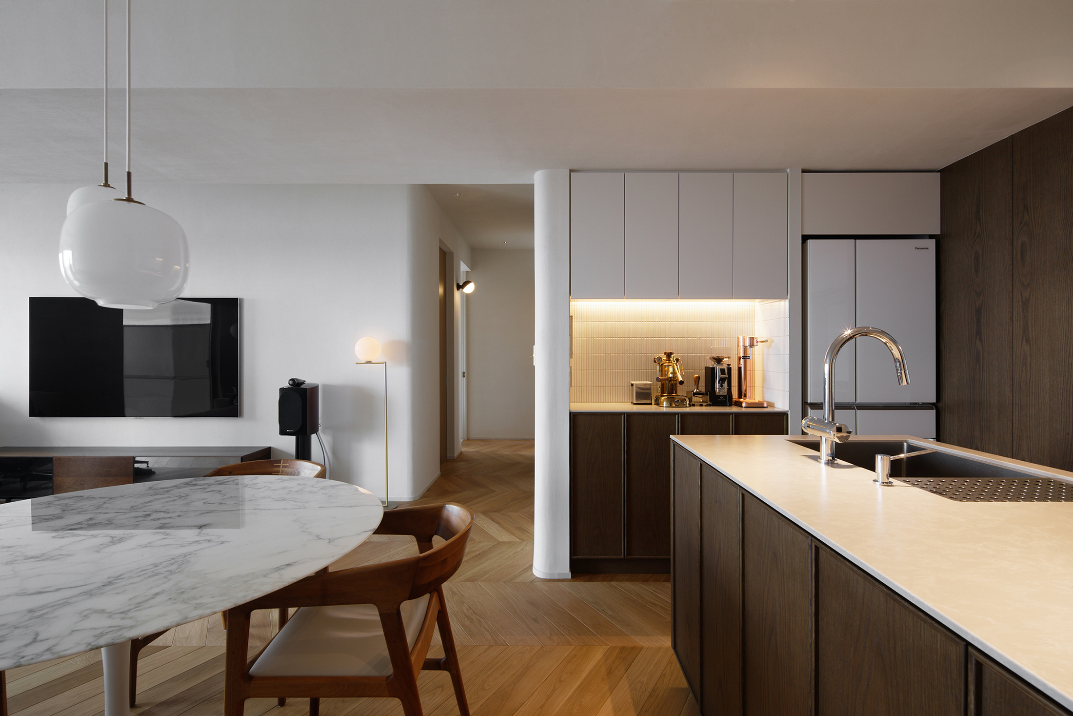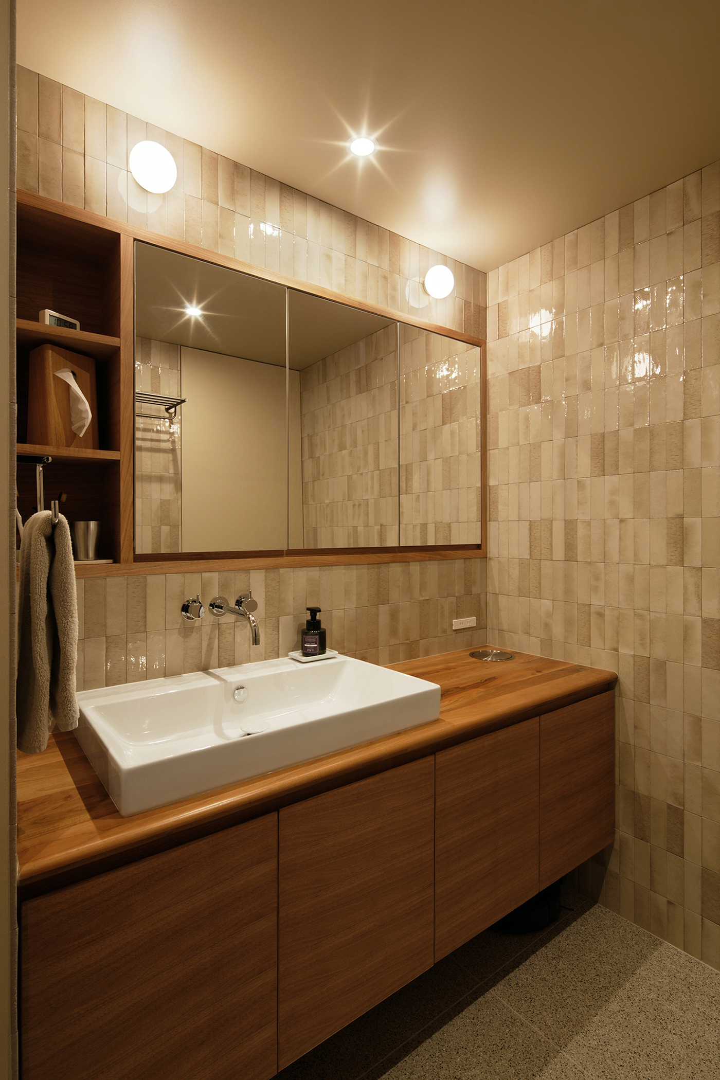 都内近郊に位置する 86 m²のマンションリノベーションです。海外生活が長かったクライアントは日本のマンションで多く利用されている化学的な建材ではなく、自然素材を用いた家 造りを求めており、都会というよりも以前住んでいた海外の昔ながらの田舎の家が持つ「素の良さ」を設計では目指しました。建物は築年数も経過しておらず断熱性能も低下していな いことから既存断熱材を残してのフルリノベーションとし、間取りは倉庫代わりとなっていた1部屋をリビング・ダイニングに組み込んだ2LDK となっています。クライアントは数多 くのデザイナー家具を所有しており、年月が経過しても良さが保たれるものに価値を感じていました。そこでクライアントが求めたヘリンボーンのフローリング、左官壁、キッチンの 面材などの僅かな寸法や見付の高さ、幅やテクスチャをクライアントがお持ちの家具のテイストと調和するように吟味することを設計の主眼としています。家具の台輪の僅かな寸法の 微調整、扉の木材の導管の表現、目地なしのタイル、最小限の照明、いままで利用してたテーブルを洗面台へのリメイクなどクライアントが心地よく感じる空間を一緒に模索しながら クライアントにとって心地よい空間に仕立てました。