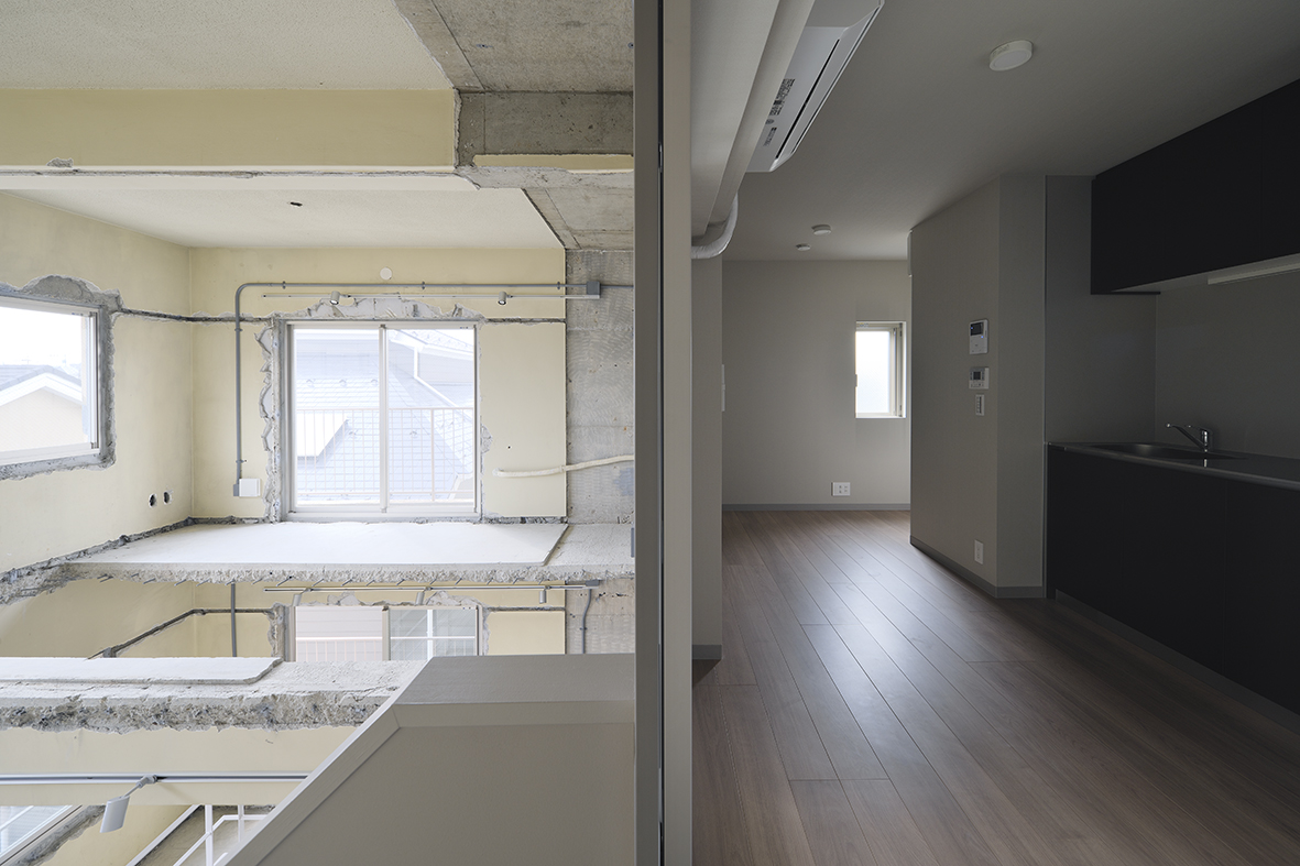 築 52 年の RC 壁式共同住宅の改修です。各戸区分所有ではなく 1 棟をワンオーナーが所有しており、先代から受け継いだ現オーナーからは建物を解体して新築するのではなく 地域のために現状を残したまま活かす事を求められました。昨今都心のタワーマンションなどは価格狂乱が生じておりますが、都心周縁部のターミナル駅から 1 駅行けば、このような ストックは入居者も多くなく不動産オーナーとしても悩みのタネとなっています。人口減少に直面する郊外においてストック活用するにも新築建て替えをするにしても金銭的な課題がハード ルが高く、そのまま使うにしても耐震性・断熱性など建物の性能面も課題になります。構造家との協議の中で「壁式構造は床を抜き吹き抜けを作ることで耐震性を向上する」という話が本物件の鍵となりま した。不動産的には真逆な発想で床を削減し、吹き抜けを作り不動産的な付加価値をつけることにしました。ただ事業費も決して潤沢でない状況から残りのお金で出来ることも限られており、 許される予算で断熱性のある程度担保された居住空間を作りました。結果生まれた、解体した状況でとどめた場所をカスタマイズルームと名付けています。予算が潤沢だったらカスタマイズ ルームは生まれなかったかもしれないですが、偶然にも生まれたこの部屋は荒々しさもあるからか内部でありながら自然の中にいるような不思議な空間となっています。3 層吹き抜けなど不 必要なまでのスケール感がそうさせているかもしれないです。ただこのカスタマイズルームを体感してから快適な居住空間を見ると、何か薄っぺらい物足りないを感じてしまう自分がいます。 枠にはめられているような、すべてが整えられている窮屈さのような感じです。それが賃貸住宅では普通の状態かもしれませんが、カスタマイズルームがあることで居住者の生活・暮らし・ 楽しみが広がり、暮らしの中での関わりが広がるような気がしています。