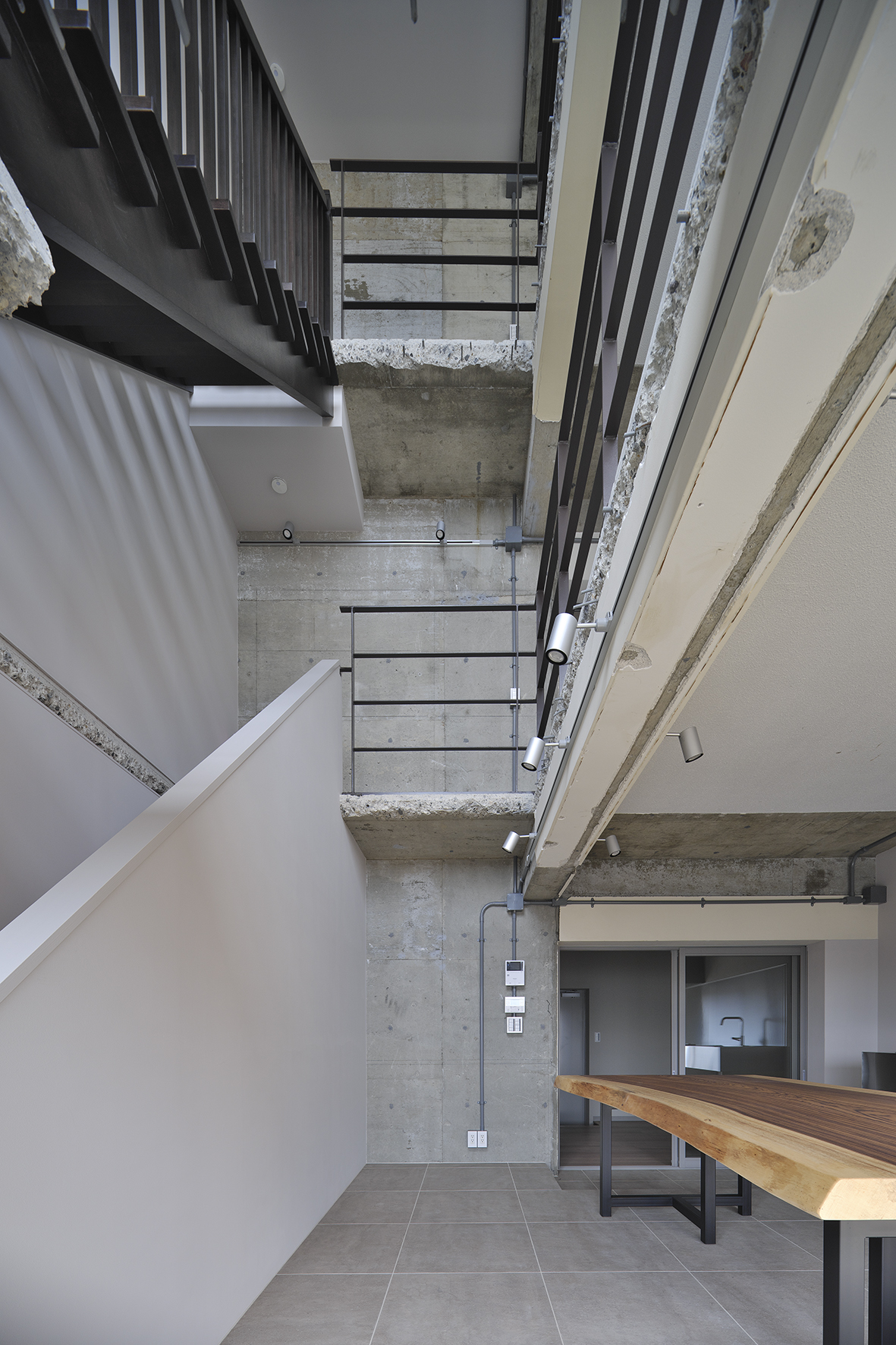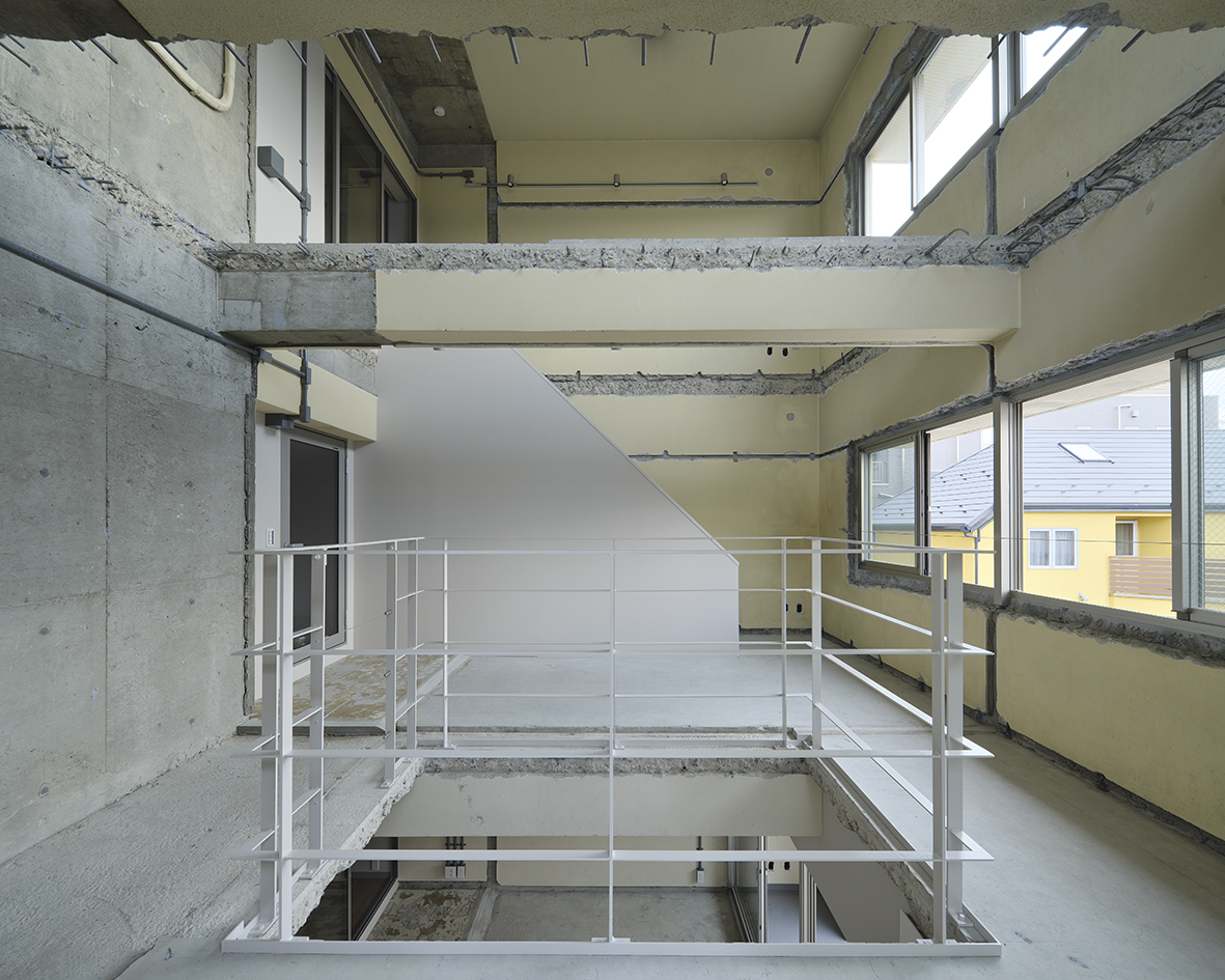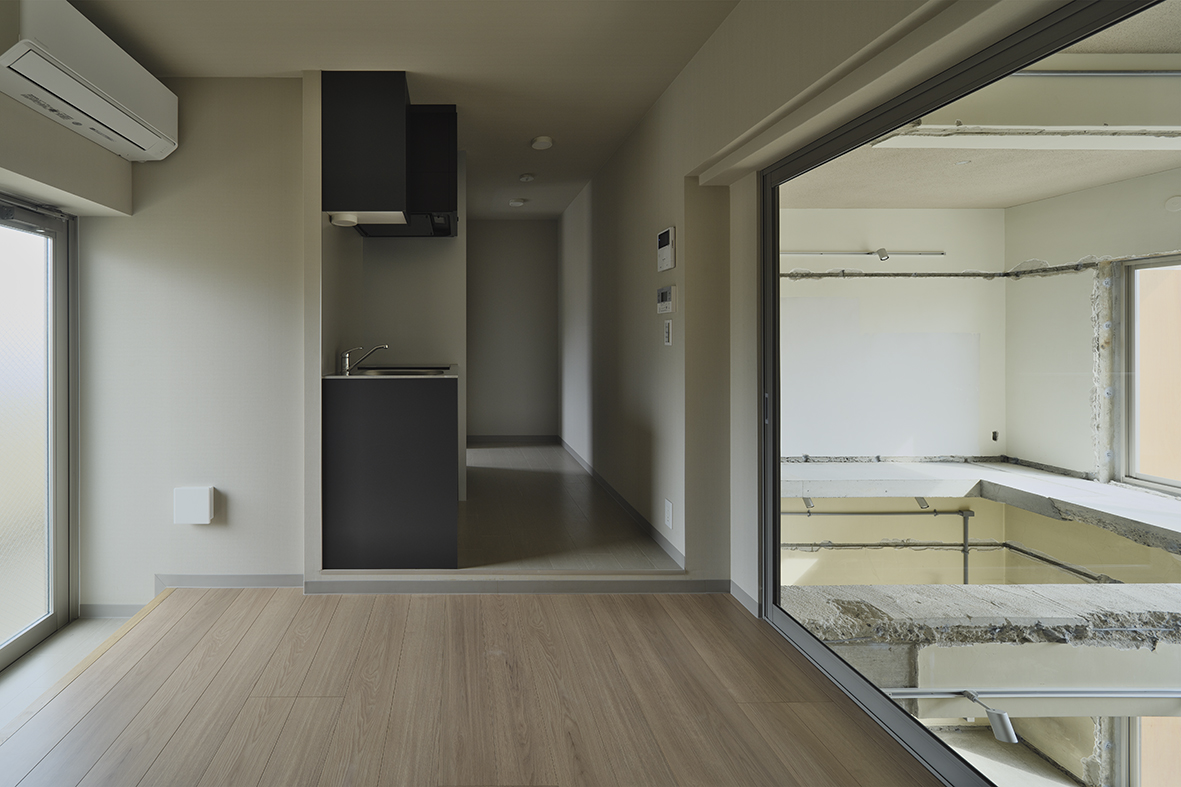 築 52 年の RC 壁式共同住宅の改修です。各戸区分所有ではなく 1 棟をワンオーナーが所有しており、先代から受け継いだ現オーナーからは建物を解体して新築するのではなく 地域のために現状を残したまま活かす事を求められました。昨今都心のタワーマンションなどは価格狂乱が生じておりますが、都心周縁部のターミナル駅から 1 駅行けば、このような ストックは入居者も多くなく不動産オーナーとしても悩みのタネとなっています。人口減少に直面する郊外においてストック活用するにも新築建て替えをするにしても金銭的な課題がハード ルが高く、そのまま使うにしても耐震性・断熱性など建物の性能面も課題になります。構造家との協議の中で「壁式構造は床を抜き吹き抜けを作ることで耐震性を向上する」という話が本物件の鍵となりま した。不動産的には真逆な発想で床を削減し、吹き抜けを作り不動産的な付加価値をつけることにしました。ただ事業費も決して潤沢でない状況から残りのお金で出来ることも限られており、 許される予算で断熱性のある程度担保された居住空間を作りました。結果生まれた、解体した状況でとどめた場所をカスタマイズルームと名付けています。予算が潤沢だったらカスタマイズ ルームは生まれなかったかもしれないですが、偶然にも生まれたこの部屋は荒々しさもあるからか内部でありながら自然の中にいるような不思議な空間となっています。3 層吹き抜けなど不 必要なまでのスケール感がそうさせているかもしれないです。ただこのカスタマイズルームを体感してから快適な居住空間を見ると、何か薄っぺらい物足りないを感じてしまう自分がいます。 枠にはめられているような、すべてが整えられている窮屈さのような感じです。それが賃貸住宅では普通の状態かもしれませんが、カスタマイズルームがあることで居住者の生活・暮らし・ 楽しみが広がり、暮らしの中での関わりが広がるような気がしています。