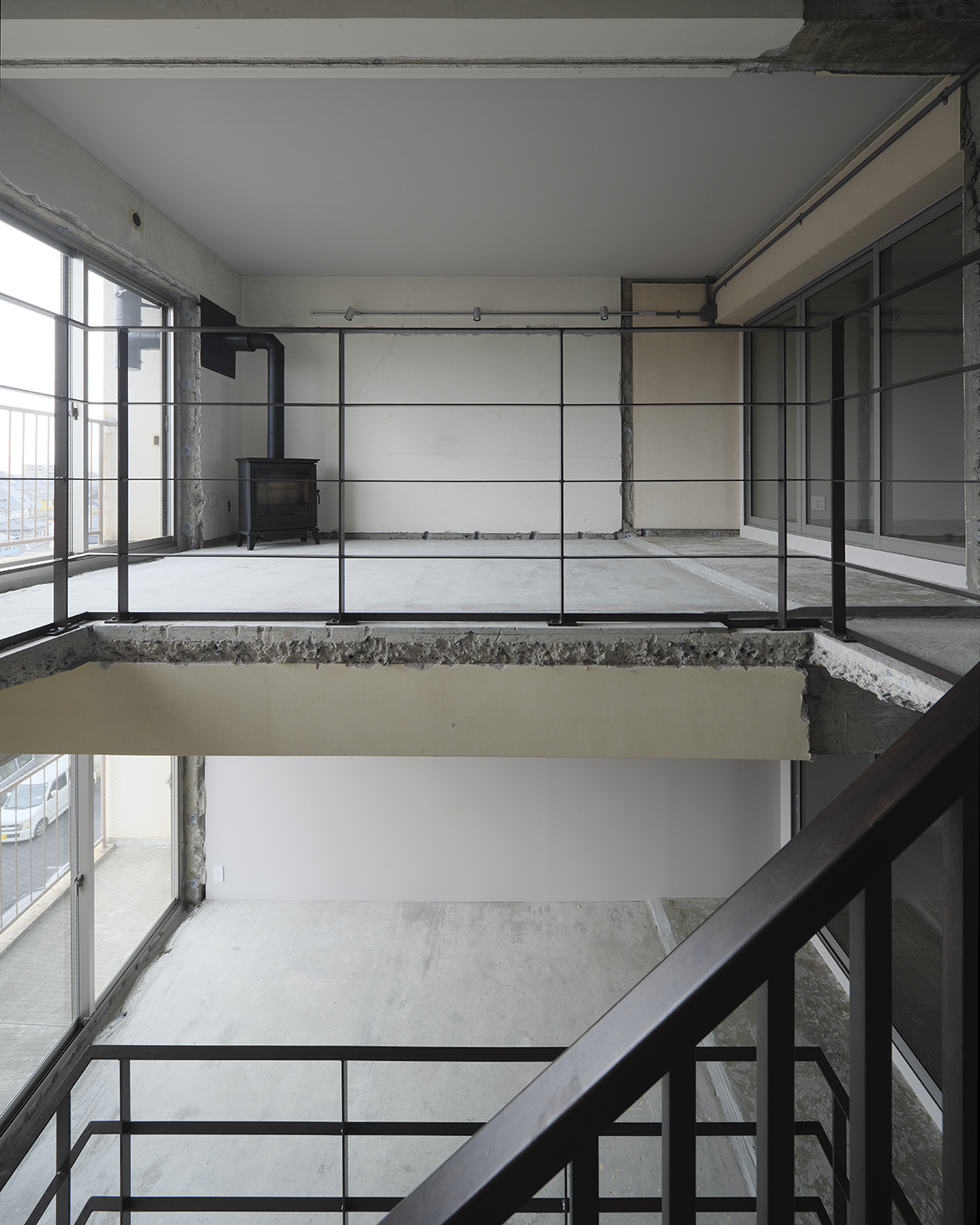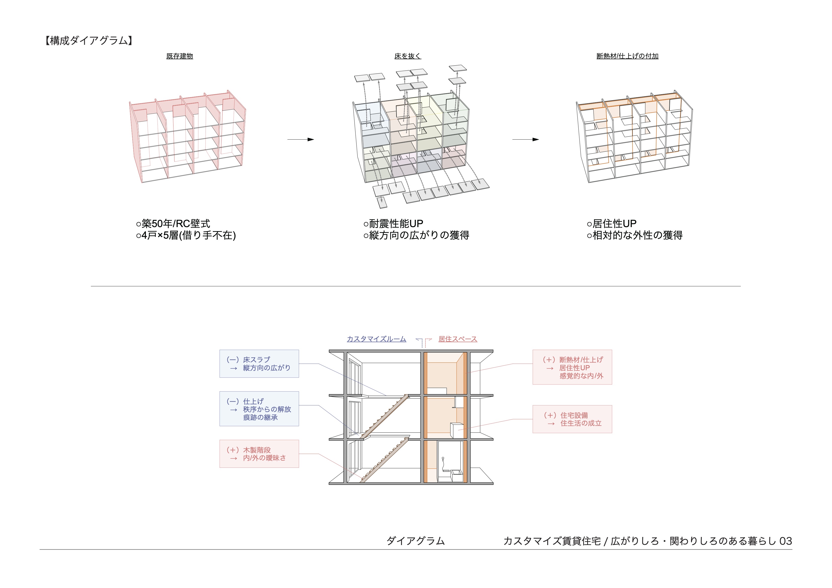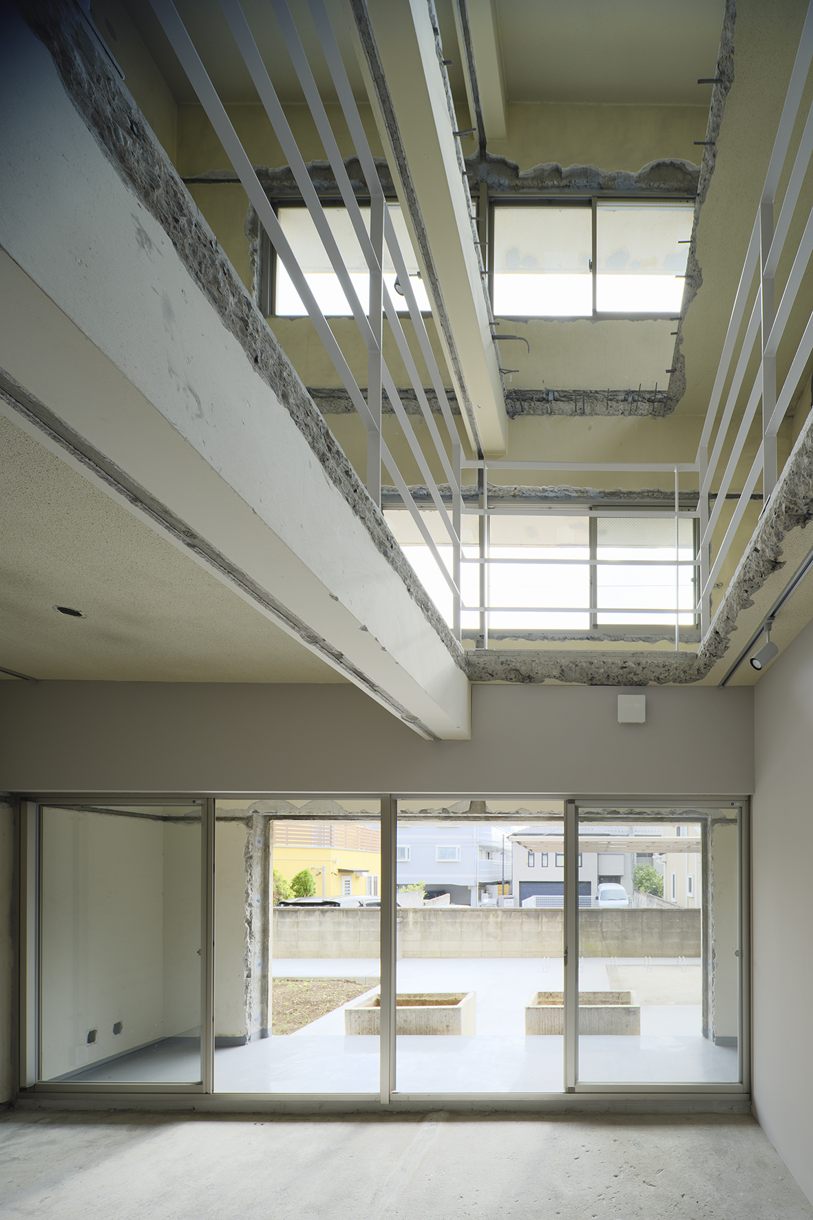 築 52 年の RC 壁式共同住宅の改修です。各戸区分所有ではなく 1 棟をワンオーナーが所有しており、先代から受け継いだ現オーナーからは建物を解体して新築するのではなく 地域のために現状を残したまま活かす事を求められました。昨今都心のタワーマンションなどは価格狂乱が生じておりますが、都心周縁部のターミナル駅から 1 駅行けば、このような ストックは入居者も多くなく不動産オーナーとしても悩みのタネとなっています。人口減少に直面する郊外においてストック活用するにも新築建て替えをするにしても金銭的な課題がハード ルが高く、そのまま使うにしても耐震性・断熱性など建物の性能面も課題になります。構造家との協議の中で「壁式構造は床を抜き吹き抜けを作ることで耐震性を向上する」という話が本物件の鍵となりま した。不動産的には真逆な発想で床を削減し、吹き抜けを作り不動産的な付加価値をつけることにしました。ただ事業費も決して潤沢でない状況から残りのお金で出来ることも限られており、 許される予算で断熱性のある程度担保された居住空間を作りました。結果生まれた、解体した状況でとどめた場所をカスタマイズルームと名付けています。予算が潤沢だったらカスタマイズ ルームは生まれなかったかもしれないですが、偶然にも生まれたこの部屋は荒々しさもあるからか内部でありながら自然の中にいるような不思議な空間となっています。3 層吹き抜けなど不 必要なまでのスケール感がそうさせているかもしれないです。ただこのカスタマイズルームを体感してから快適な居住空間を見ると、何か薄っぺらい物足りないを感じてしまう自分がいます。 枠にはめられているような、すべてが整えられている窮屈さのような感じです。それが賃貸住宅では普通の状態かもしれませんが、カスタマイズルームがあることで居住者の生活・暮らし・ 楽しみが広がり、暮らしの中での関わりが広がるような気がしています。